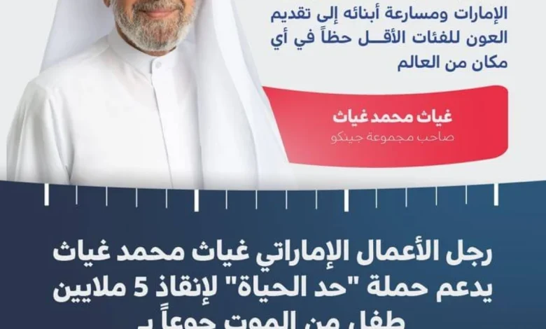 انضم رجل الأعمال الإماراتي غياث محمد غياث، صاحب مجموعة جينكو، إلى قائمة المساهمين في حملة “حد الحياة” لإنقاذ 5 ملايين طفل من الموت جوعاً، التي أطلقها صاحب السمو الشيخ محمد بن راشد آل مكتوم نائب رئيس الدولة رئيس مجلس الوزراء حاكم دبي رعاه الله بالتزامن مع شهر رمضان، بهدف جمع مليار درهم وتوجيهها نحو تنفيذ برامج ومشاريع مستدامة تسهم في مكافحة جوع الأطفال في العالم، حيث أعلن عن تقديم 8 ملايين درهم دعماً للحملة.