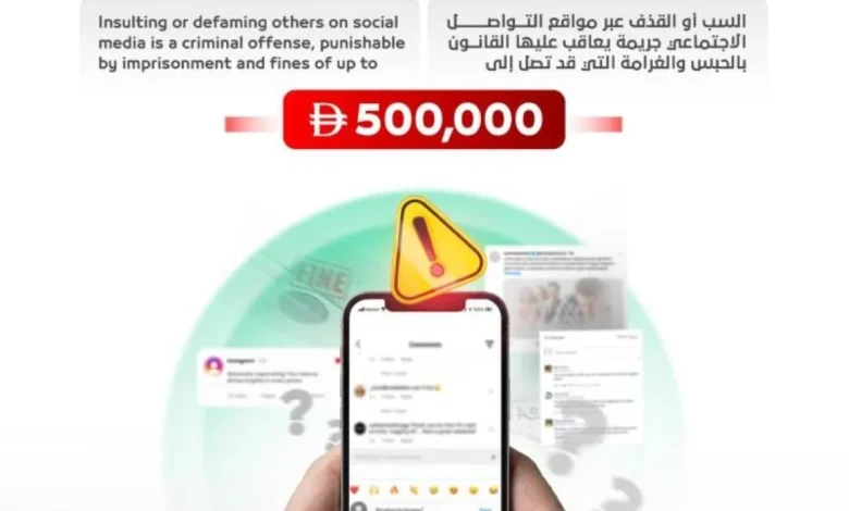 وتتضمن الحملة مادة توعوية تحمل رسالة بعنوان: «راقب كلماتك قبل أن تنشرها… Think before you post»، تؤكد أن السب أو القذف عبر مواقع التواصل الاجتماعي يُعد جريمة يعاقب عليها القانون بالحبس والغرامة التي قد تصل إلى 500 ألف درهم.