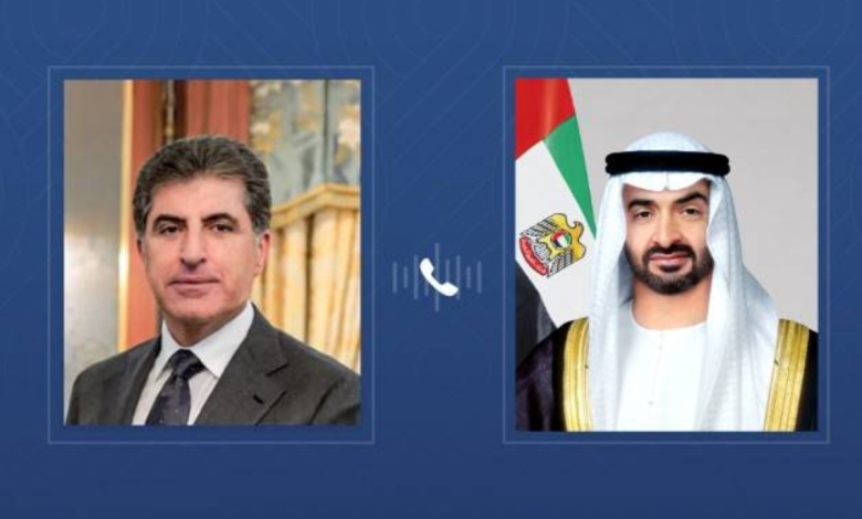 رئيس الدولة يتلقى اتصالاً هاتفياً من رئيس إقليم كردستان العراق، وأدان خلاله الهجوم الإرهابي على قنصلية الإمارات