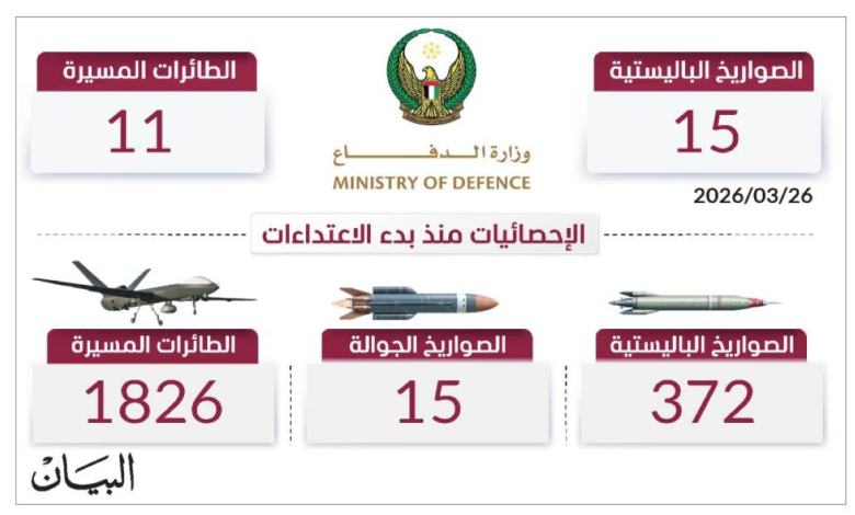 اعترضت الدفاعات الجوية الإماراتية أمس 15 صاروخاً باليستياً و11 طائرة مسيّرة قادمة من إيران. ومنذ بدء الاعتداءات الإيرانية السافرة تعاملت الدفاعات الجوية الإماراتية مع 372 صاروخاً باليستياً، و15 صاروخاً جوالاً، و1826 طائرة مسيّرة.