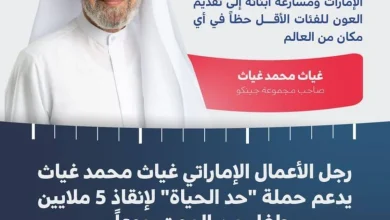 انضم رجل الأعمال الإماراتي غياث محمد غياث، صاحب مجموعة جينكو، إلى قائمة المساهمين في حملة “حد الحياة” لإنقاذ 5 ملايين…
